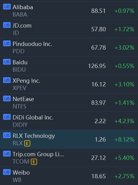 Some chinese ADRs climbed in morning trading. Alibaba rose nearly 1%, Pinduoduo and XPeng rose 3%, RLX Technology rose 8%.