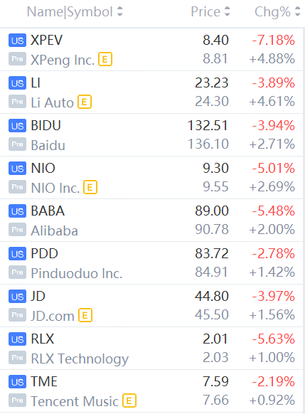 XPeng, Li Auto rose over 4%; Baidu, Alibaba rose over 2%; Pinduoduo, JD.com, RLX Technology rose over 1%.