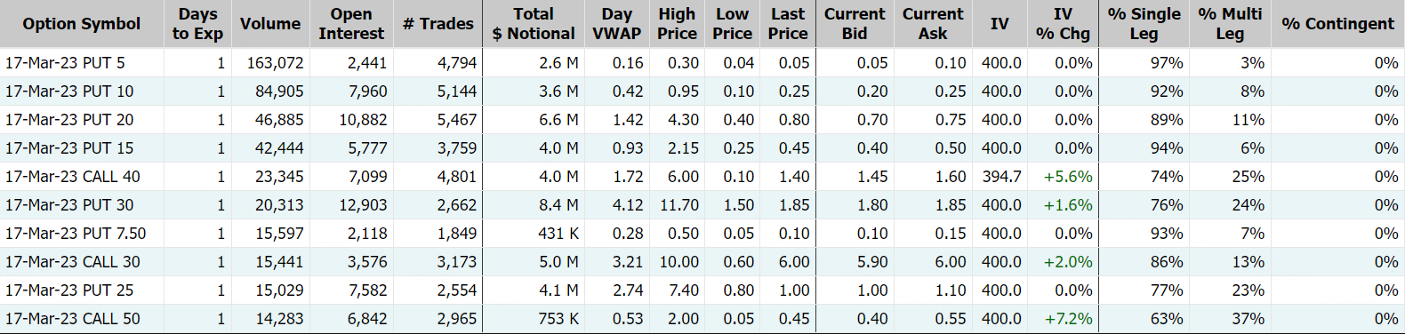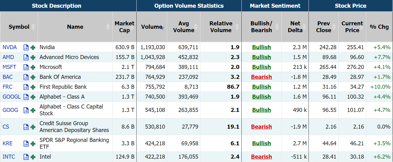 第一共和银行股价周四大幅震荡,盘中一度下跌36%,在几家大型银行同意向该行增加300亿美元存款后,其股价止跌转涨,收盘上涨近10%,但在该行宣布暂停支付股息并表示将集中精力减少借款之后,其股价在盘后交易中再度大跌近17%;第一共和银行期权成交75.58万张,较90日平均成交量放大逾86倍,其中看跌期权占比68.7%。