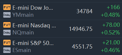 At 8:33 a.m. ET, Dow e-minis were up 166 points, or 0.48%, S&P 500 e-minis were up 21 points, or 0.46%, and Nasdaq 100 e-minis were down 78 points, or 0.52%.