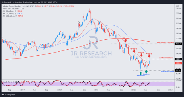 However, we didn't expect a bull trap to form again so soon at its near-term resistance. As a result, we believe that BABA could continue trading at a range below the $120 level. Therefore, we think it's apt to rescind our medium-term PT of $160 given the price action developments.
