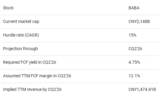 Finally, using a blended FCF margin of 12.1%, we require Alibaba to post a TTM revenue of CNY1,474.91B by CQ2'26. The revised consensus estimates indicate that Alibaba could deliver revenue of CNY1,167B in FY25 (ending March 2025).
