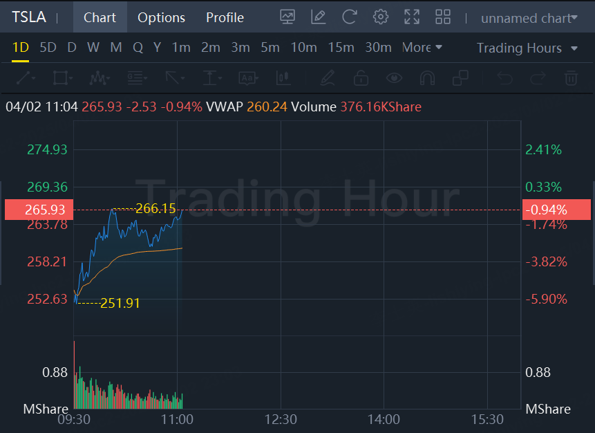 Tesla shares trimmed their losses to less than 1%. The shares briefly sank more than 6% after the company reported disappointing deliveries for the first quarter.