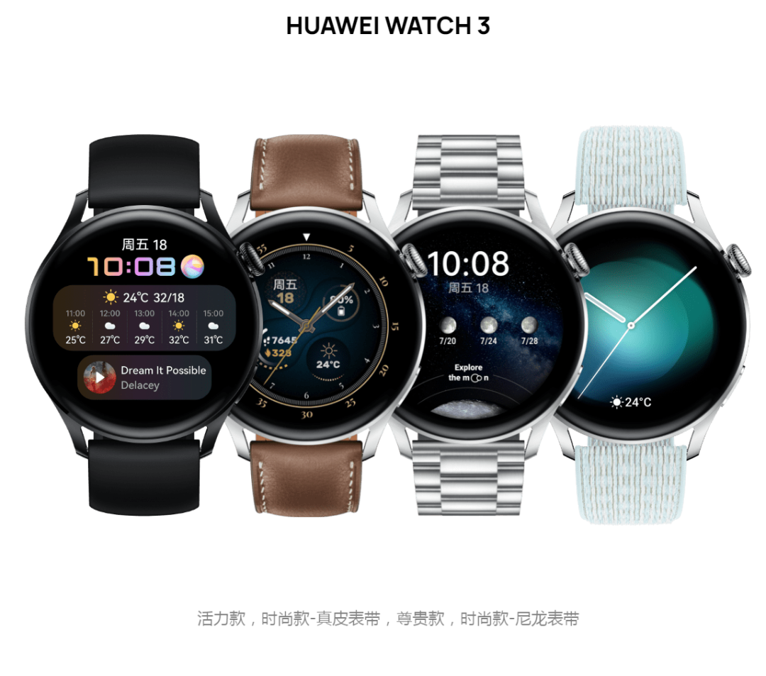 华为WATCH 3拥有运动款、时尚款(真皮表带)、时尚款(尼龙表带)、尊享款四个款式。