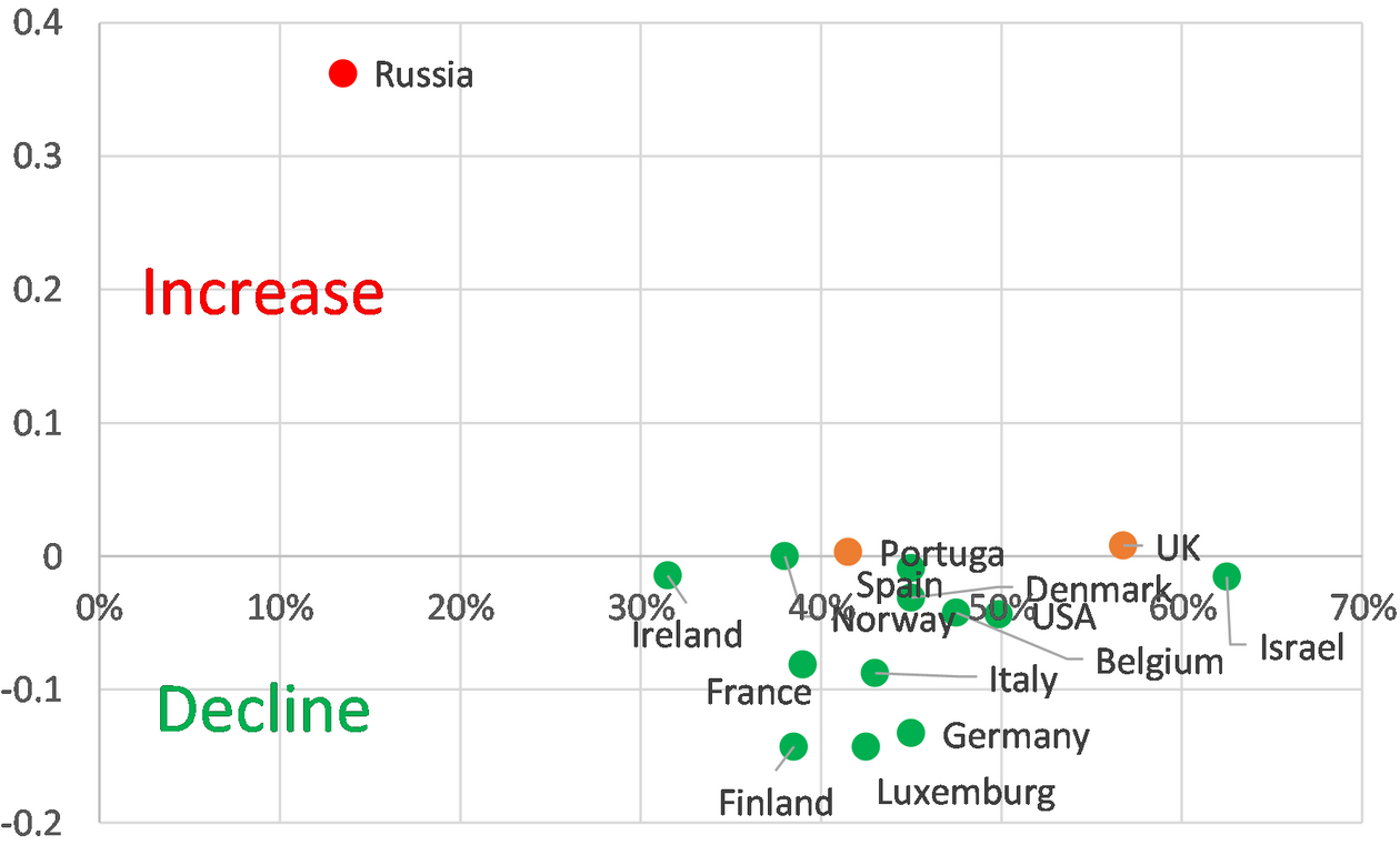 June % change in peak COVID-19 mortality vs. vaccination rate in 15 countries most affected by the delta variant.