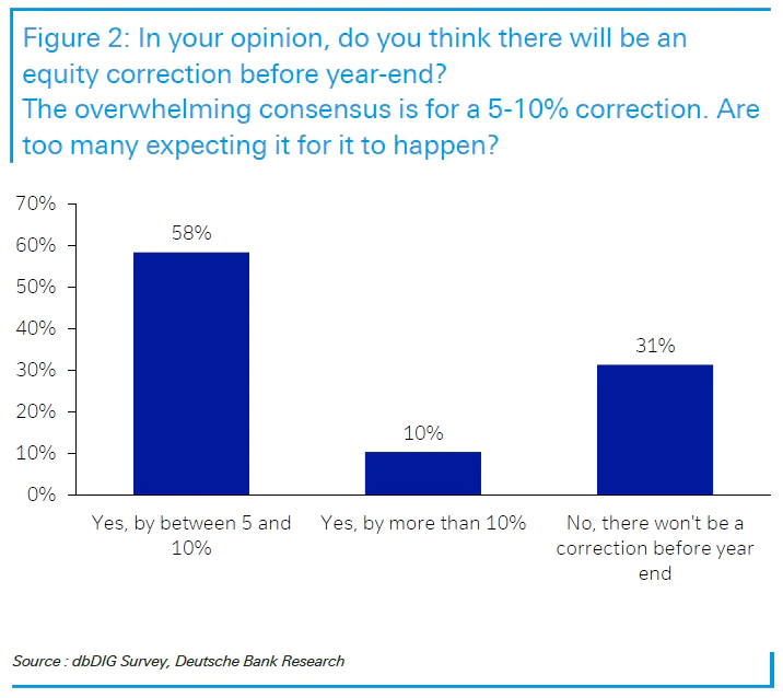 LONDON, Sept 13 (Reuters) - An equity market correction of 5%-10% by the end of the year was the majority prediction in a September market sentiment survey published by Deutsche Bank on Monday, in the latest sign of market caution that the equity bull run will end.