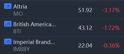 Altria Group Inc., which sells Marlboro cigarettes in the U.S., dropped 3.2% in morning trading.British American Tobacco Plc fell 1.7% higher. Imperial Brands Plc, the maker of Kool cigarettes, fell 0.4%, trimming earlier gains.