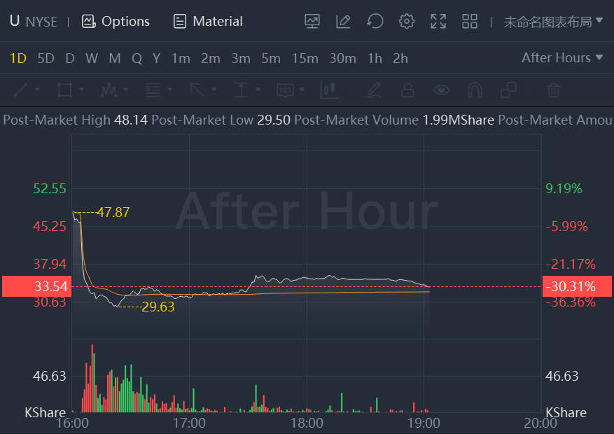 Unity Software Inc. shares plummeted 30% to $33.54 in late trading Tuesday after the company issued second-quarter revenue guidance below analysts' expectations in conjunction with its first-quarter results.