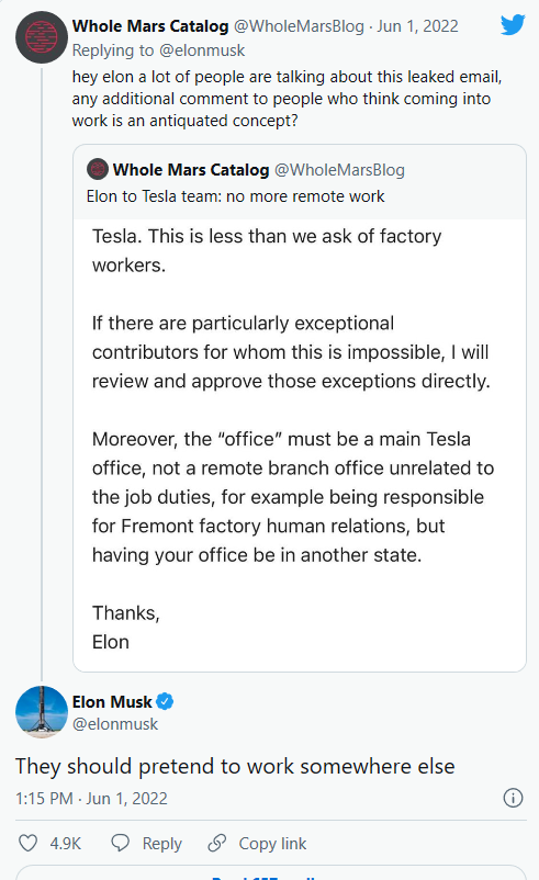 That was Tesla's $(TSLA)$ chief executive officer Elon Musk, responding to an apparent leaked email making the rounds that was addressed to the electric-car maker's executive staff and entitled: "Remote work is no longer acceptable."