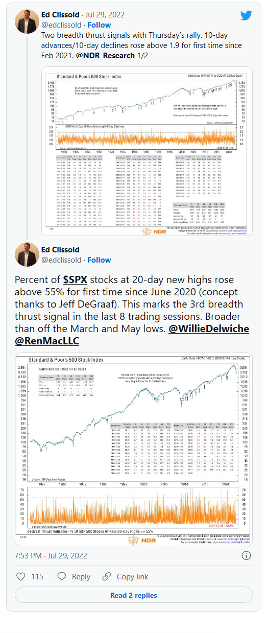 As for the latest moves, they noted that earlier rallies off the March and May lows triggered two other breadth thrust signals each. "The fact that each of the three indicators that fired in July did not earlier in 2022 is a change worth noting," the analysts wrote.