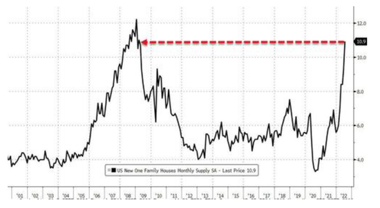 销售萎靡的同时,美国新屋库存高企。截至7月末,有46.4万套新房待售,为2008年以来最多。按照目前的销售速度计算,将需要10.9个月才能清空新房供应,这是自2009年3月以来的最高库销比,几乎是今年年初的两倍。