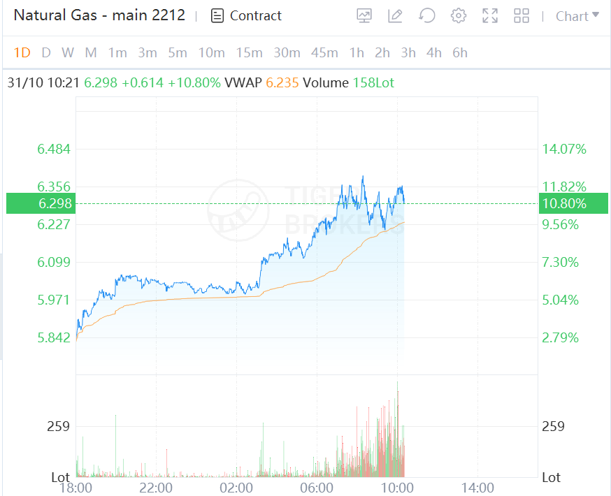 Front-month gas futures were up 56.8 cents, or 10.0%, to $6.252 per million British thermal units (mmBtu) at 8:46 a.m. EDT (1246 GMT), putting the contract on track for its highest close since Oct. 14.