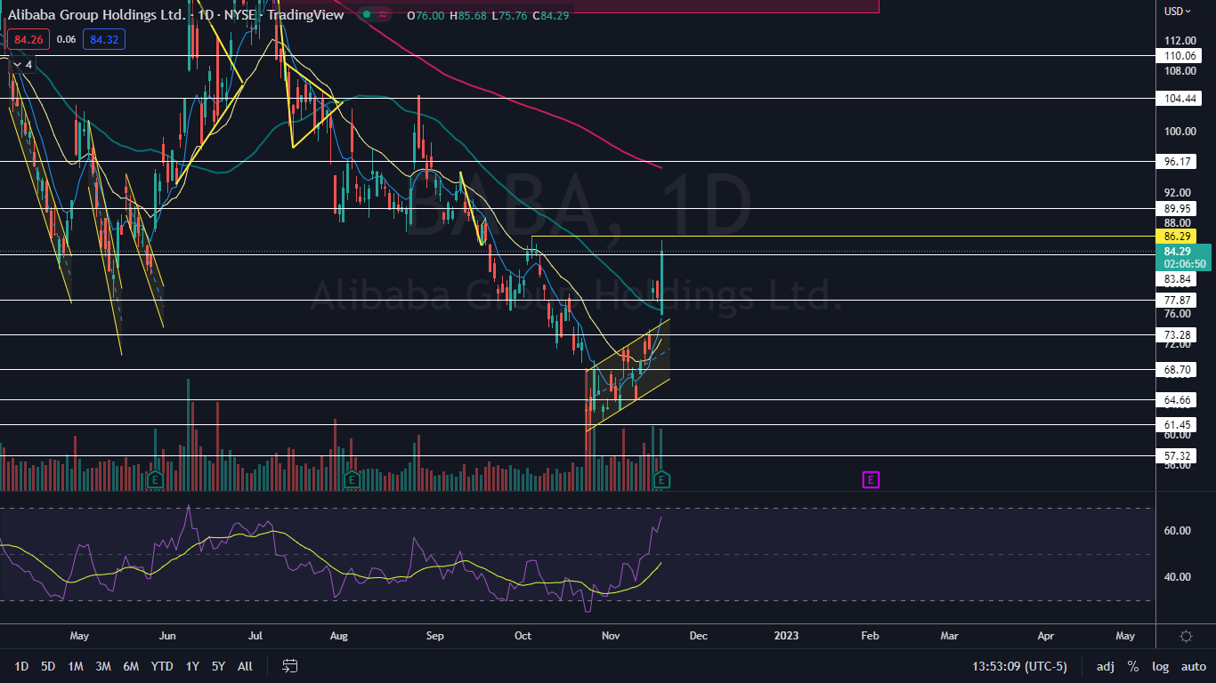 The Alibaba Chart: Alibaba reversed course into an uptrend on Oct. 24 and has made a consistent series of higher highs and higher lows. The most recent higher low was formed on Thursday at $75.76 and the most recent confirmed higher high was printed at the $80.45 mark on Wednesday.