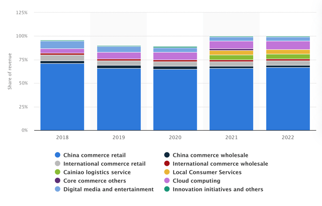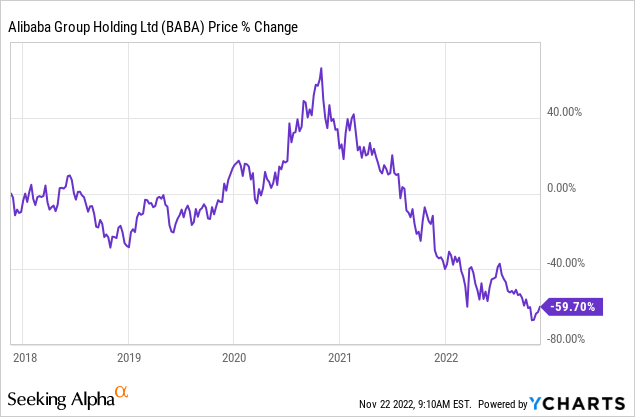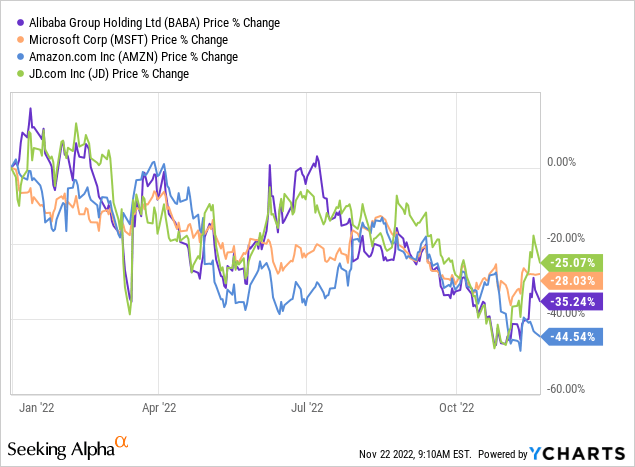 Alibaba stock is down around 63% over the past five years. YTD, the stock is down almost 35%. YTD, Alibaba is down alongside most of its peer group, with JD.com (JD)(HKG: 9618) dropping nearly 25%, Microsoft (MSFT) almost 28%, and Amazon (AMZN) around 56%. Our bullish thesis on the stock is based on our belief that the stock pullback creates an attractive entry point to invest in the company's 2023 growth.