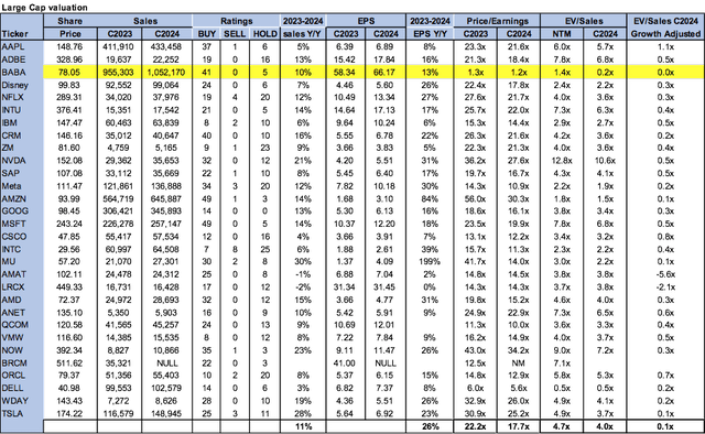 - We like Alibaba's position in the cloud market, specifically with the Alibaba Cloud growing 4% Y/Y despite macroeconomic headwinds.
