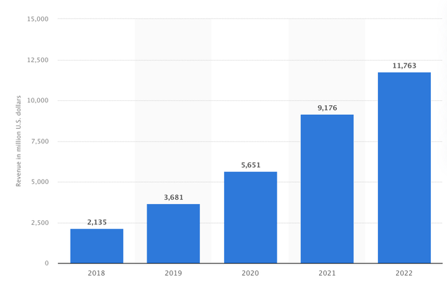 The following graph outlines Alibaba Cloud's growth between 2018-2022.