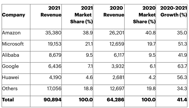 Alibaba Cloud was the company's second revenue driver in its 2Q23 earnings report, growing 4% Y/Y. Alibaba is expanding its position as a cloud provider investing $1B in a "global partner ecosystem upgrade." The Chinese Cloud provider is now the world's third-largest cloud provider after competitors Amazon (AMZN) and Microsoft (MSFT), with a worldwide market share of 9.5% in 2021, according to Gartner.