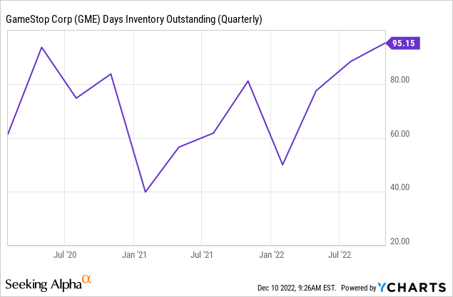 In fact, we doubt that even the low end of $5.68 billion will come to pass. GameStop is currently servicing the last hardware cycle in the gaming business and sales drop should really accelerate once we go past the fourth quarter (ending in January 2023). A lot rests even on that quarter to give the company time to survive. Inventories have bloated up and you can see in terms of sales, they are way higher than they were last two years at the same point.