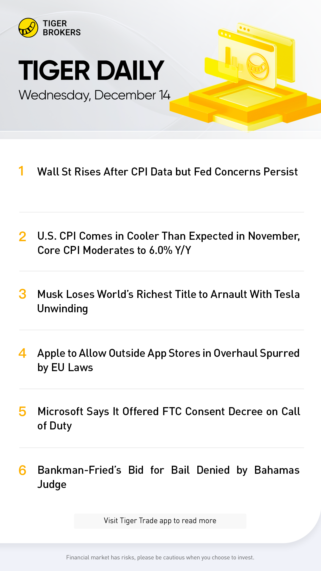 NEW YORK, Dec 13 (Reuters) - U.S. stocks rose on Tuesday after a unexpectedly small consumer price increase buoyed optimism that the Federal Reserve could soon dial back its inflation-taming interest rate hikes, but concerns remained the central back could stay aggressive.