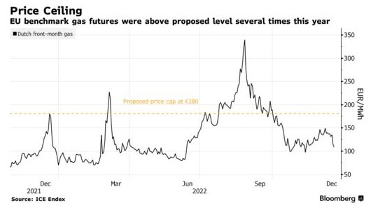 欧盟成员国正竭尽全力就一项限制天然气价格的计划达成一致,在该地区应对前所未有的能源危机之际,这一措施已使各国政府陷入了数月的分歧。据两位知情的欧盟外交官透露,周一在布鲁塞尔举行的能源部长会议正在讨论捷克政府提出的将上限降至180欧元/兆瓦时(合191美元)的最新妥协草案,比欧盟委员会上个月提议的275欧元低了近三分之一。市场干预措施预计将从明年2月初开始生效。