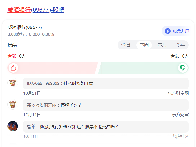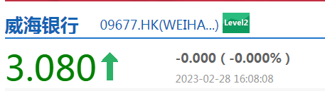 2月28日收盘。在港股上市的内地银行——威海银行,当日成交量仍然为0。
