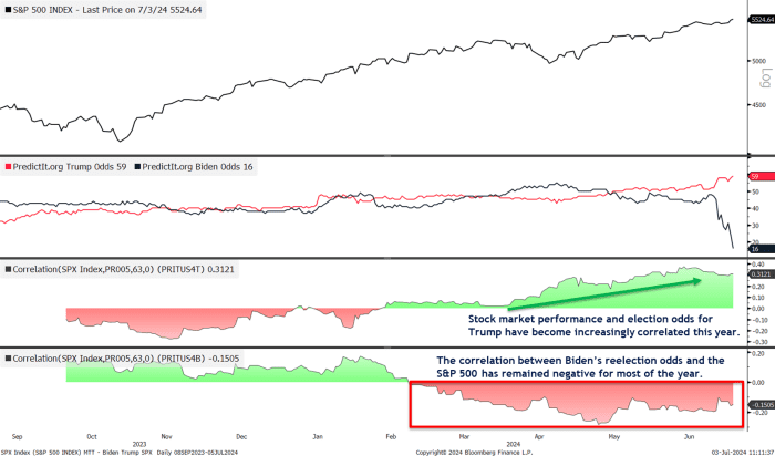 So as Trump has looked more assured of winning, the market has taken comfort in that certainty. Turnquist noted that earlier in 2024, when Biden was favored to win, the market had shown a positive correlation with the president's re-election chances.