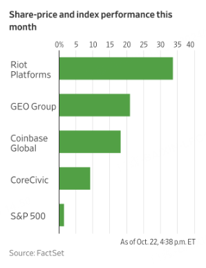 While most polling still shows a tight race, that shift has rippled across markets in recent weeks, boosting assets seen as likely to benefit from a Republican victory. For instance, private-prison operator GEO Group is up 21% in October, on pace for its best month since 2022, while bitcoin miner Riot Platforms has risen 34%.