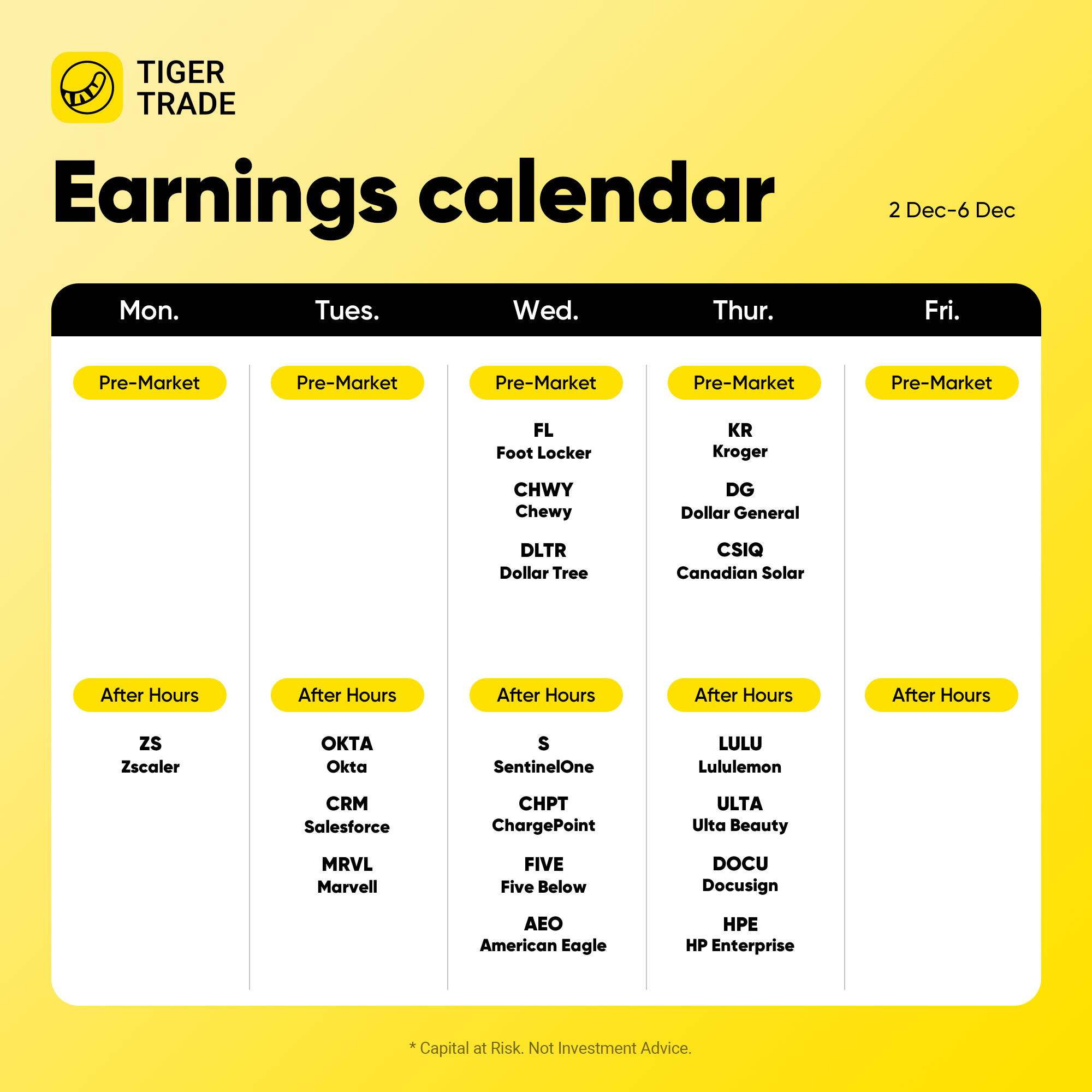 Earnings highlights this week will include Zscaler on Monday, Salesforce on Tuesday, and Campbell’s and Dollar Tree on Wednesday. Thursday will be busy: Brown-Forman, DocuSign, Dollar General, Gitlab, Hewlett Packard Enterprise, Kroger, lululemon athletica, and Ulta Beauty all report.