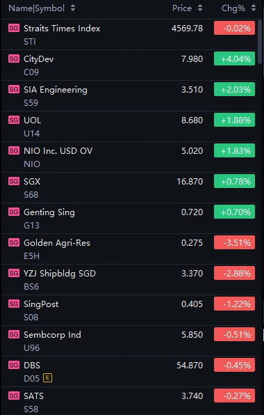 STI fell 0.1%; CityDev up 4%; SIA Engineering, UOL, Nio up 2%; Golden Agri-Res fell 4%; YZJ Shipbldg fell 3%.