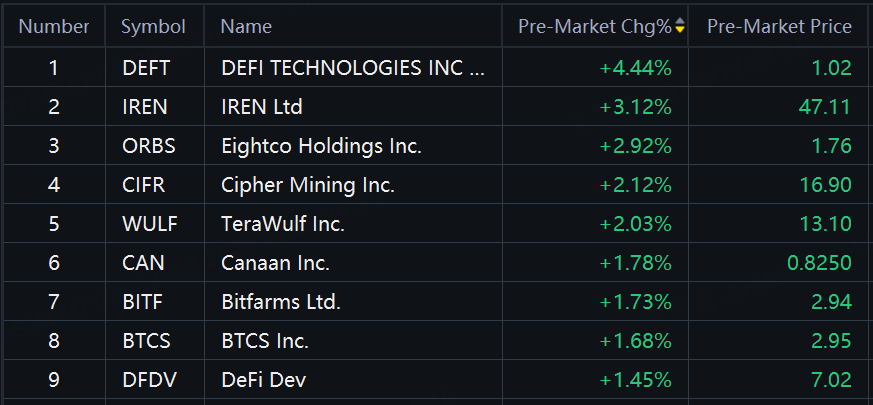 Crypto shares jumped in premarket trading. DeFi Tech up over 4%; IREN up 3%; TeraWulf up 2%.