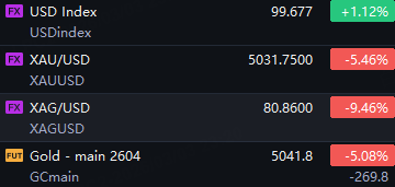 U.S. gold futures GCcv1 lost 5.1% to $5,041.80.