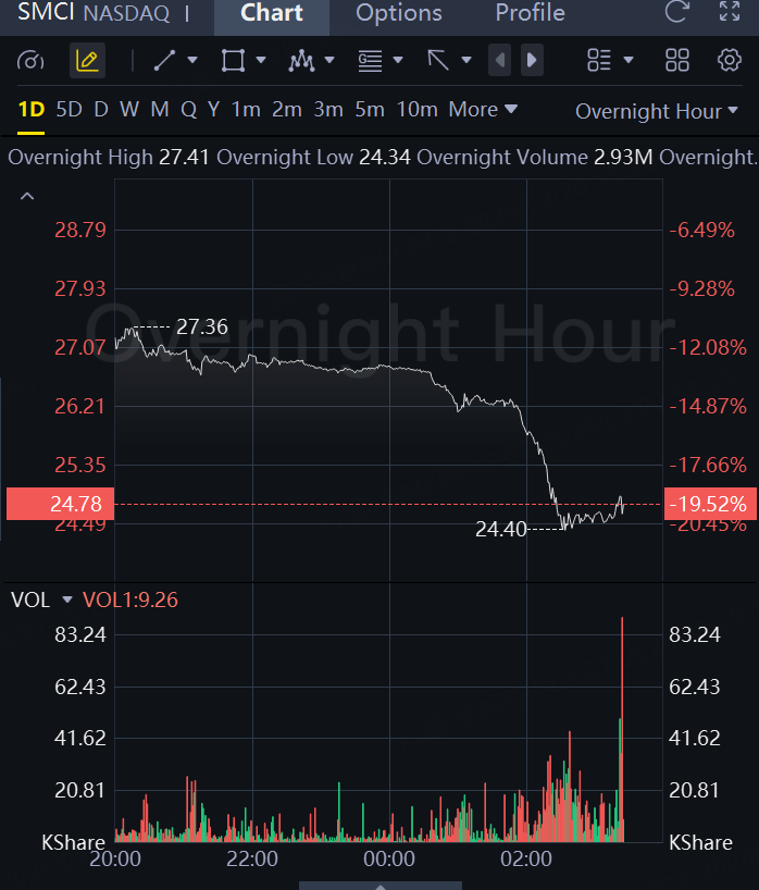 Supermicro tumbled 20% on the news in overnight trading.