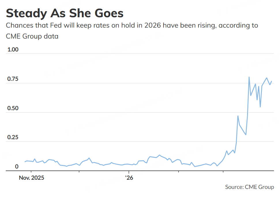 Fed-funds futures traders are pricing in a 72.7% likelihood that the Fed will keep rates steady at its December meeting, according to the CME FedWatch Tool — a sharp shift from late last year, when markets were pricing in up to four rate cuts by the end of 2026.