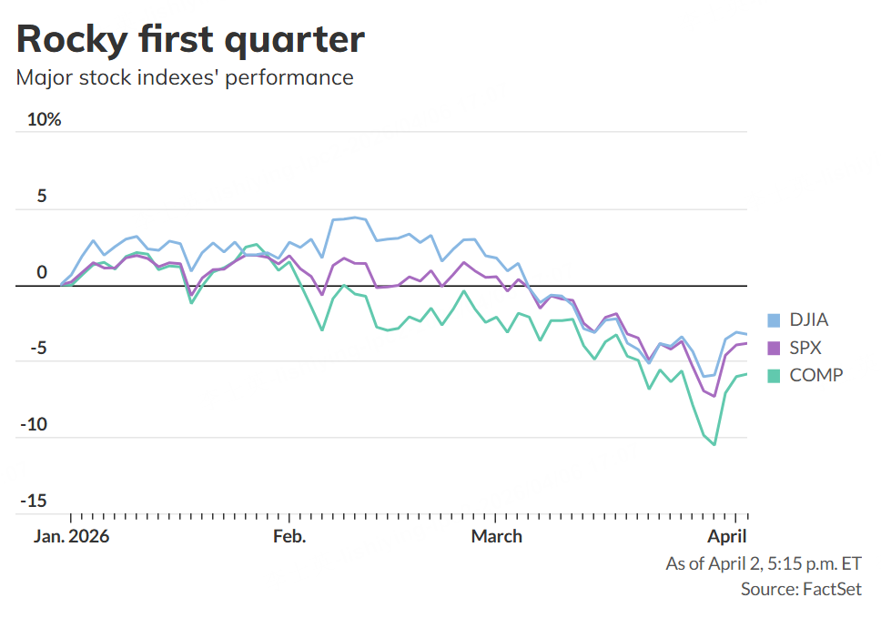 The S&P 500 fell 4.6% in the first quarter — its worst first quarter since 2022 — as U.S. stocks were dragged down by concerns about AI disruption and the intense uncertainty surrounding the Iran conflict.