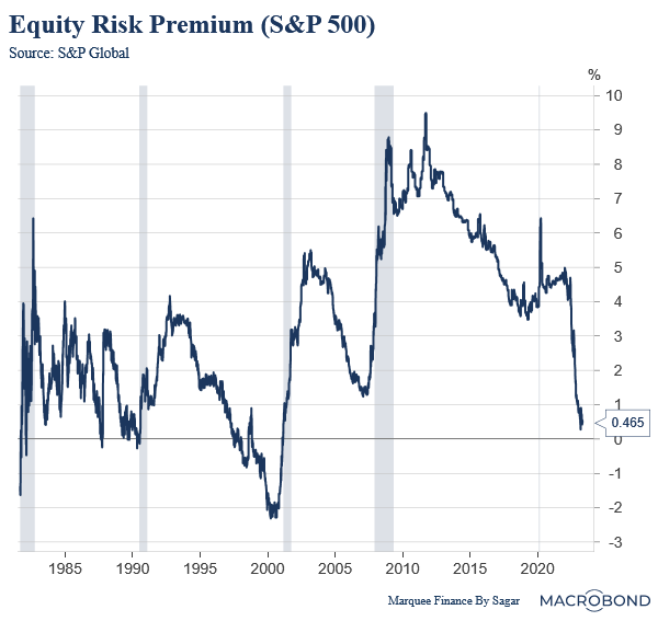 With the Fed chalking on the path of one of the most rapid monetary policy tightening and as the earnings yield skyrockets (lower PE), the equity risk premium has plunged to the lowest since the dot-com bubble.