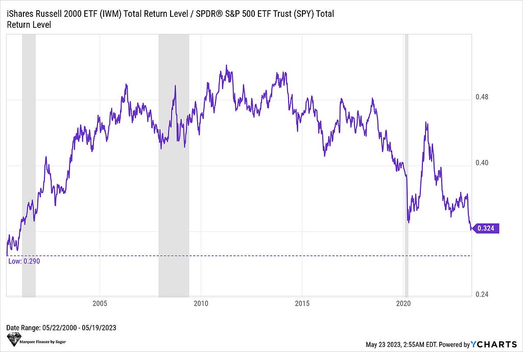 IWM has massively underperformed the SPY since the beginning of the year, and the ratio has now reached dangerously close to the dot-com bubble.
