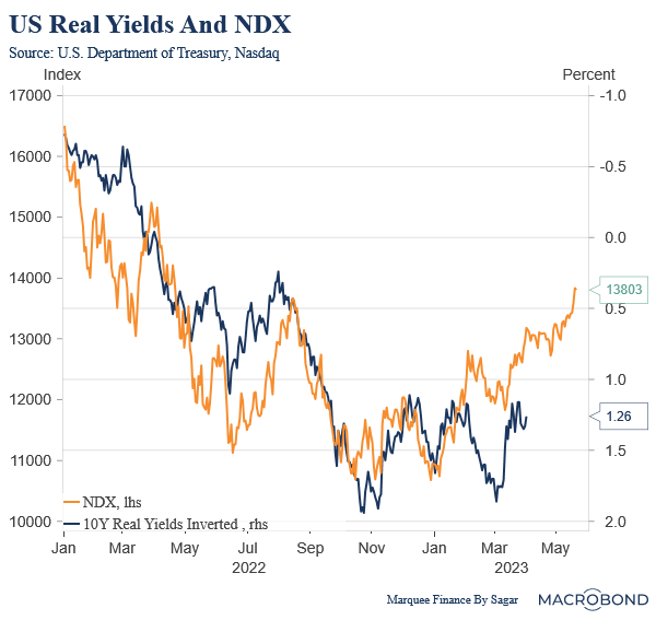 Since the Fed began tightening the monetary policy last year, real yields have been negatively correlated with the NASDAQ performance.