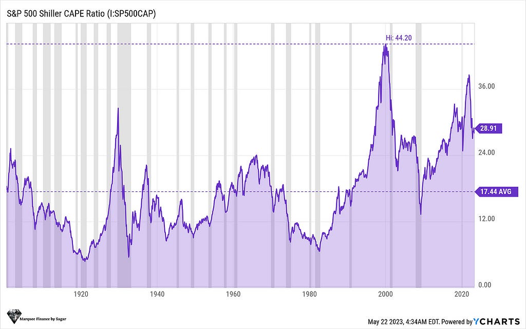 When we zoom out the chart commencing from the 1900s, the mean of the CAPE ratio comes out to be around 17.44