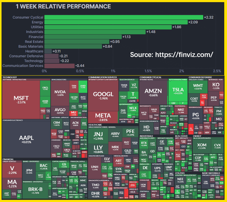 At last week, Consumer Cyclical Sector top the performances by 2.32% with $Tesla Motors(TSLA)$ rose 14.22% and $Ford(F)$ rose over 10.9% weekly, the biggest gain from July 2022.