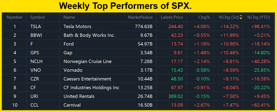 The top 10 winners of $S&P 500(.SPX)$ were $Tesla Motors(TSLA)$ $Bath & Body Works Inc.(BBWI)$ $Ford(F)$ $Gap(GPS)$ $Norwegian Cruise Line(NCLH)$ $Vornado(VNO)$ $Caesars Entertainment(CZR)$ $CF Industries Holdings Inc(CF)$ $United Rentals(URI)$ $Carnival(CCL)$