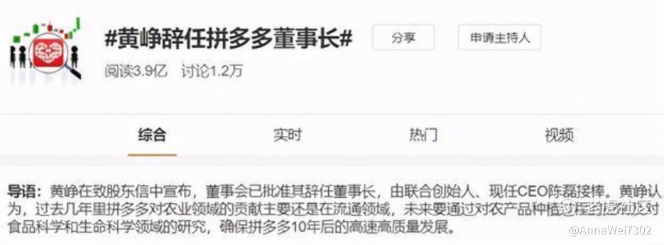 即便辭去了CEO與董事長職務,黃崢仍然持有29.4%的股份,依然是拼多多的第一大股東。