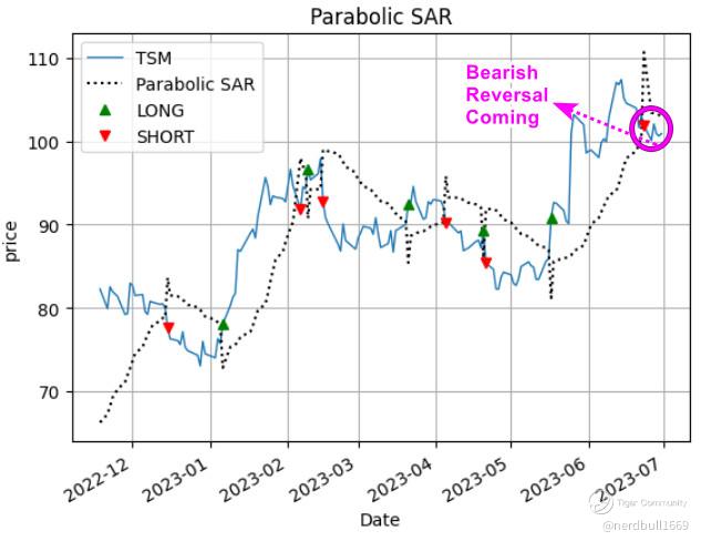 From what I have gathered, it seem like TSM is currently in a strong trend from ADX, but SAR seem to suggest that there might be a potential bearish reversal coming.