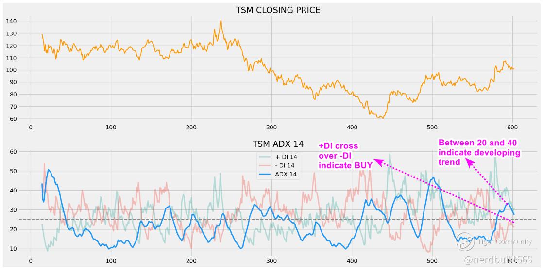 +Di cross above -DI has suggest a BUY for TSM. But before making the decision, it might be better to look at 2 other indicators.