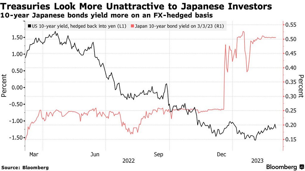 Lately, the hedged returns for Japanese investors have dwindled since the Fed began raising rates. On the contrary, the JGB yields are 0.50% after the YCC tweak late last year.