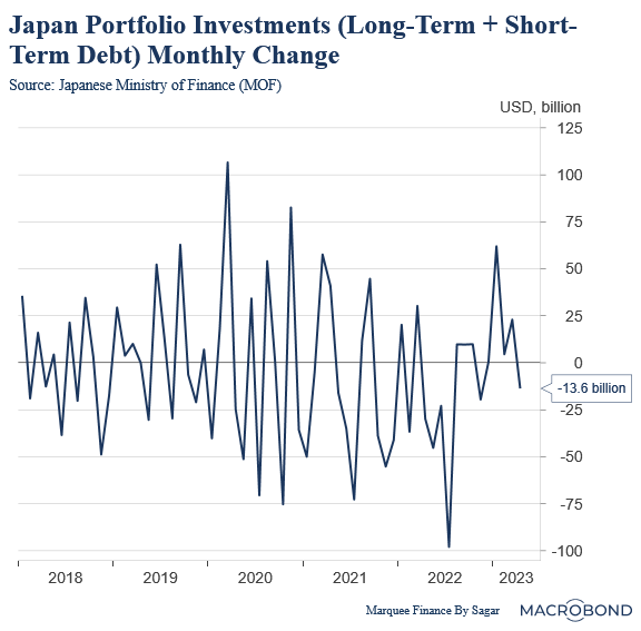 The peak selling of the foreign debt happened when JPY touched a low of 150 in September last year. As the JPY appreciated in January post the YCC raise, some buying transpired, but it was short-lived.