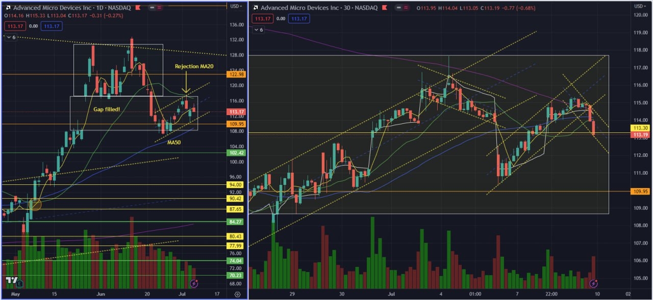 AMD - Gap filled and Rejected by MA20; 108 is key level to watch!