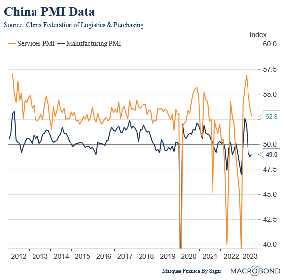 In the East, China’s troubles keep on mounting. While the manufacturing PMI is in contraction mode, the services PMI was a complete shocker.