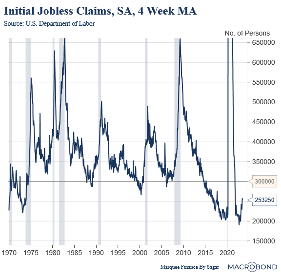 The continuing claims have moved sideways after a steep rise post the SVB fallout in March. The current number is hovering around 1.75 million. To be in cognisance of a recession, the continuing claims need to rise to at least 2.31 million, which is a whopping 40% rise from the current levels.
