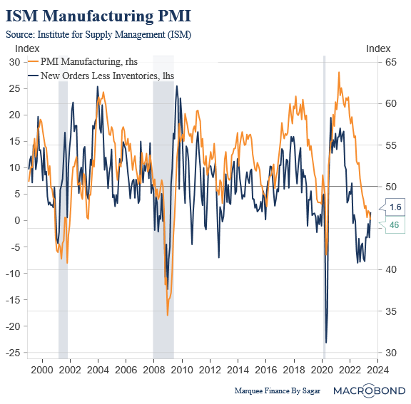 - The current signal in New Orders less Inventories is a dead cat bounce which might be “transitory” before ISM Manufacturing resumes its downtrend and breach the key 40 mark by the end of the year or Q1 24.