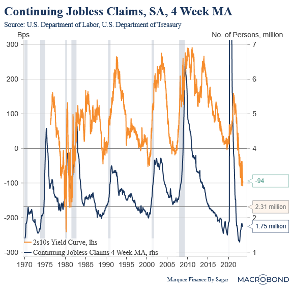 - The continuing claims data, the essential tool for traders/ investors as it’s closely linked with the yield curve inversion, remains stagnant as of now.